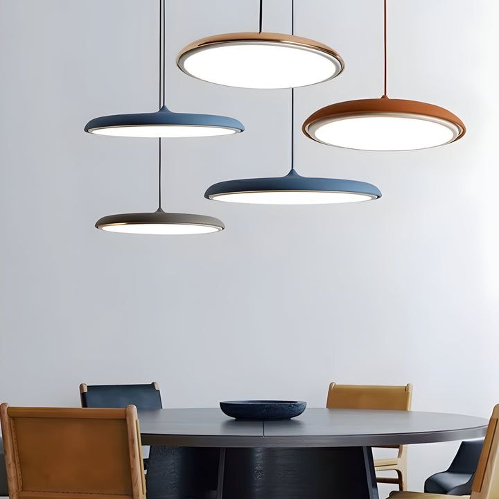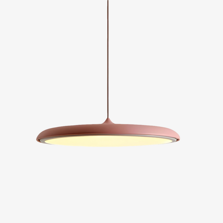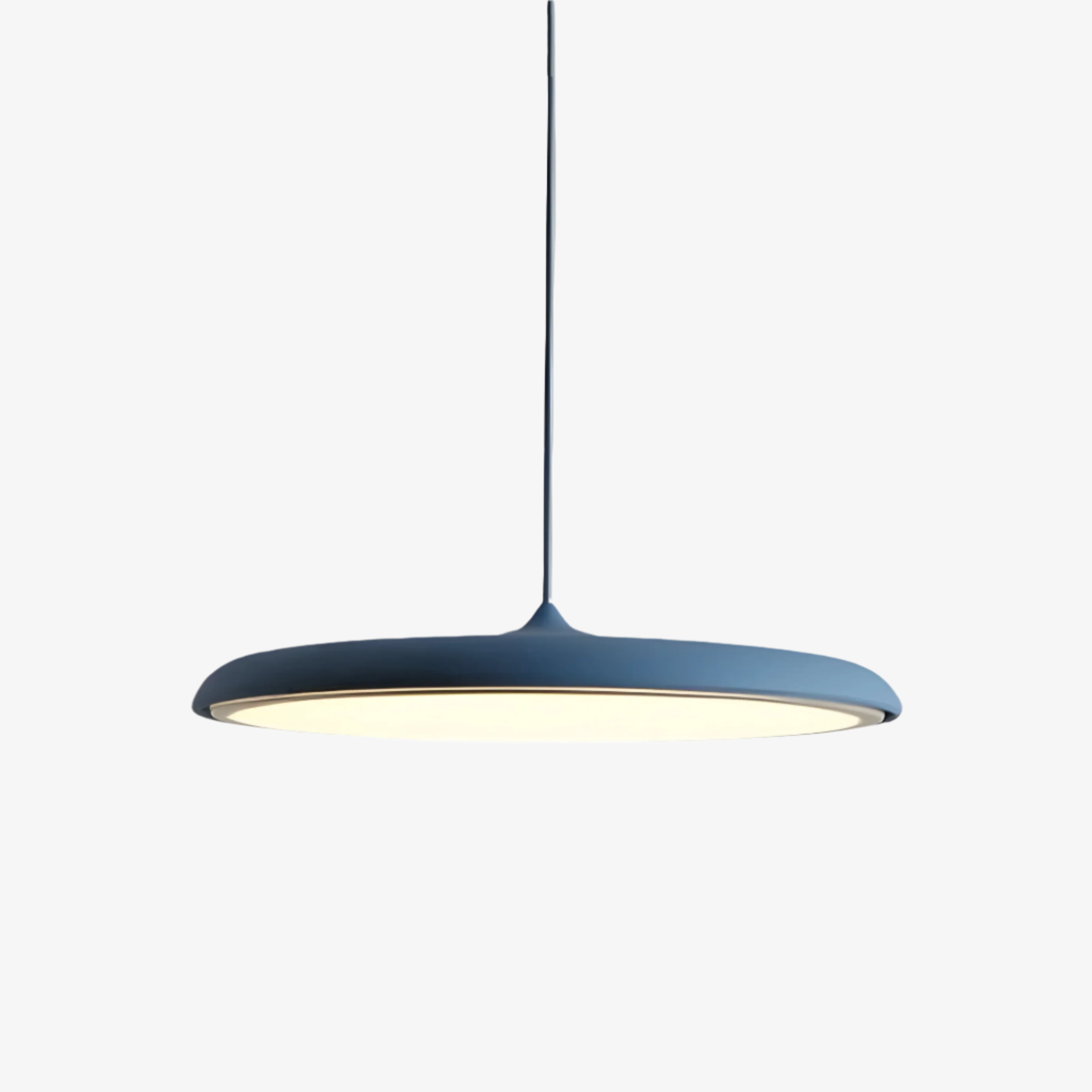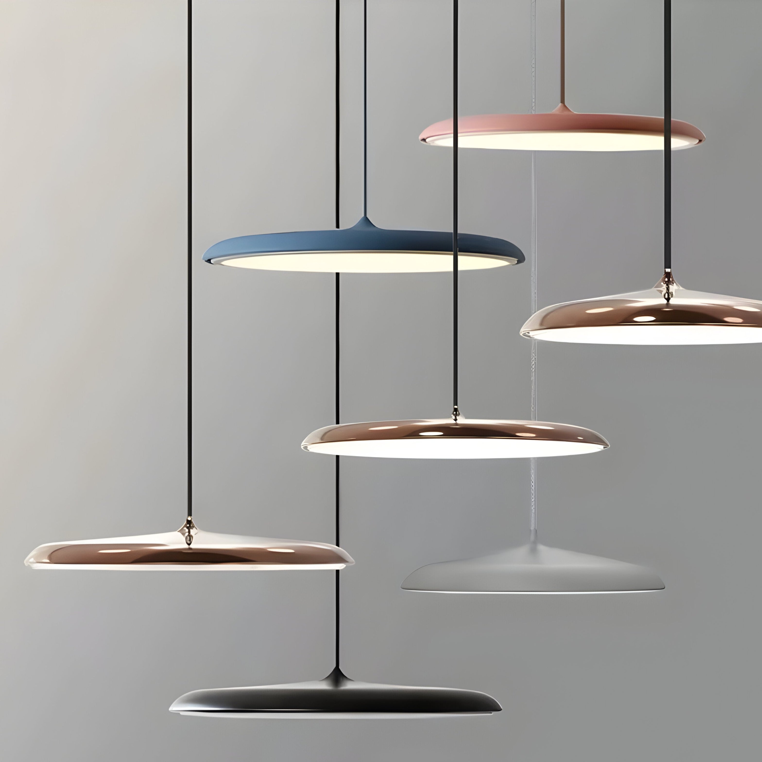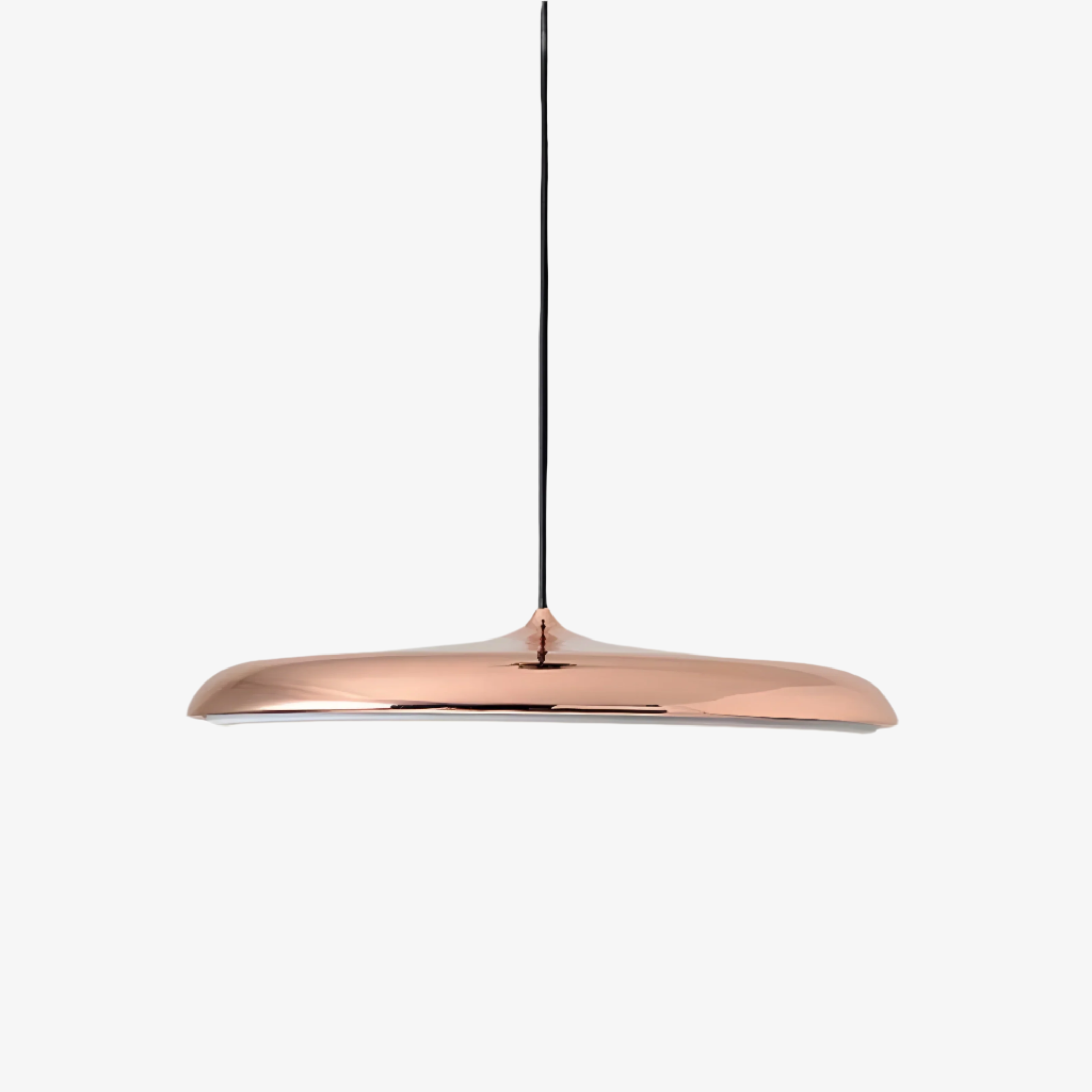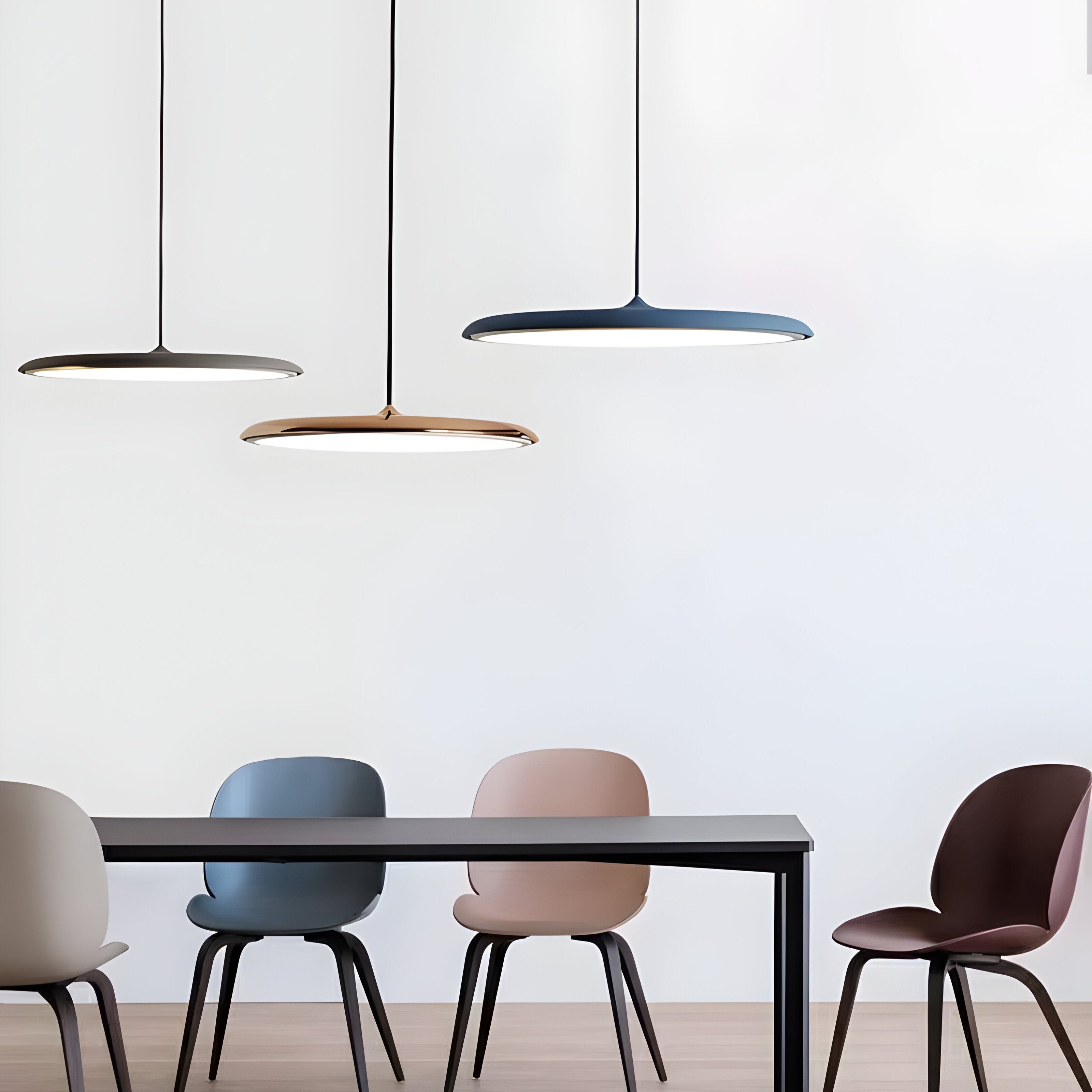 The Arvid Pendant is a modern and minimalist lighting fixture with a sleek, wide, and shallow dome design. Suspended by a thin, subtle cord, the light maintains a clean and sophisticated aesthetic. Its wide, disc-like shade provides even illumination, making it an excellent choice for dining areas, kitchen islands, and stylish commercial spaces. The combination of matte and metallic finishes adds a refined contrast, enhancing its modern appeal.
