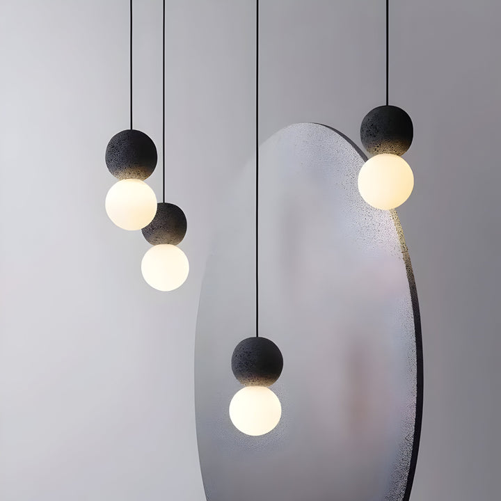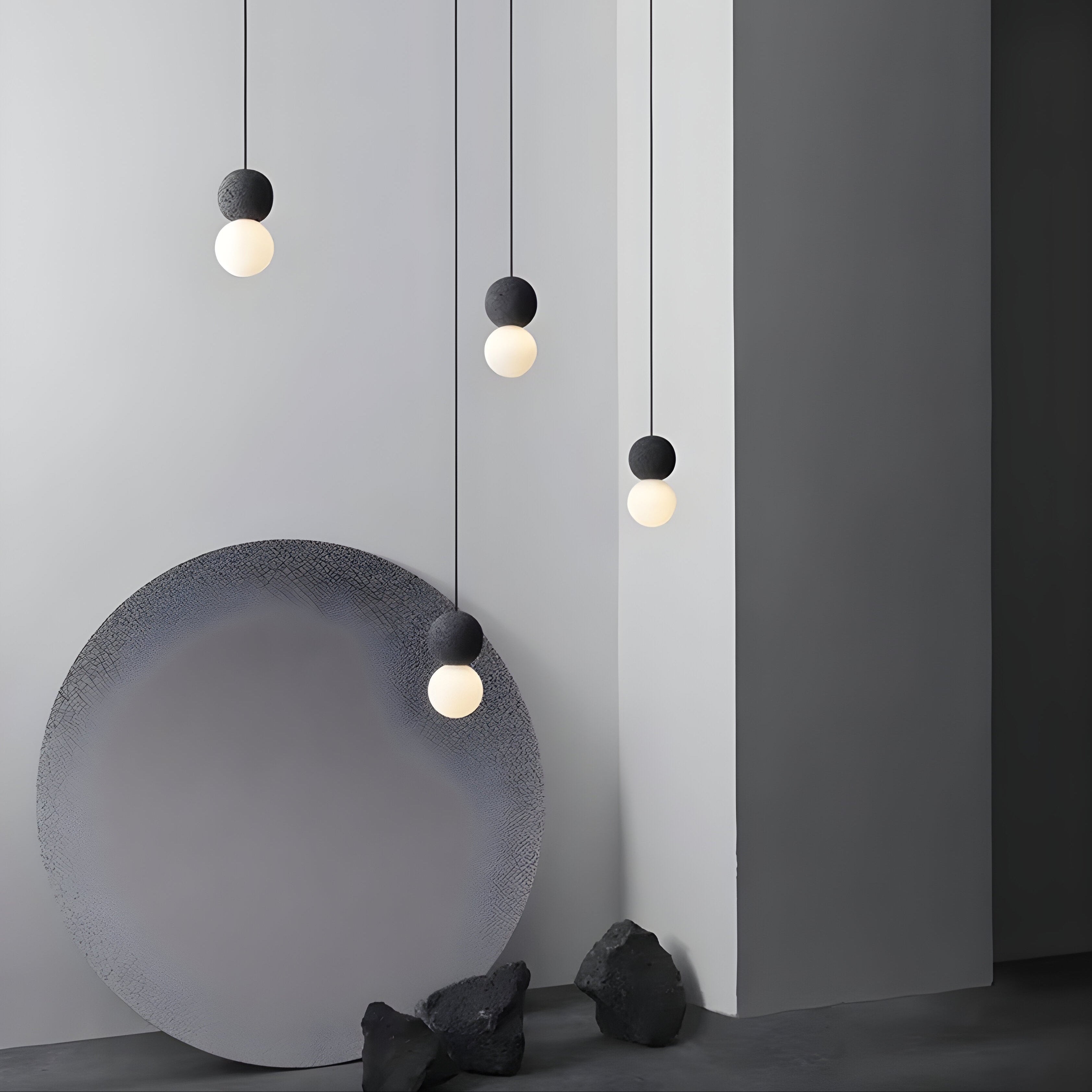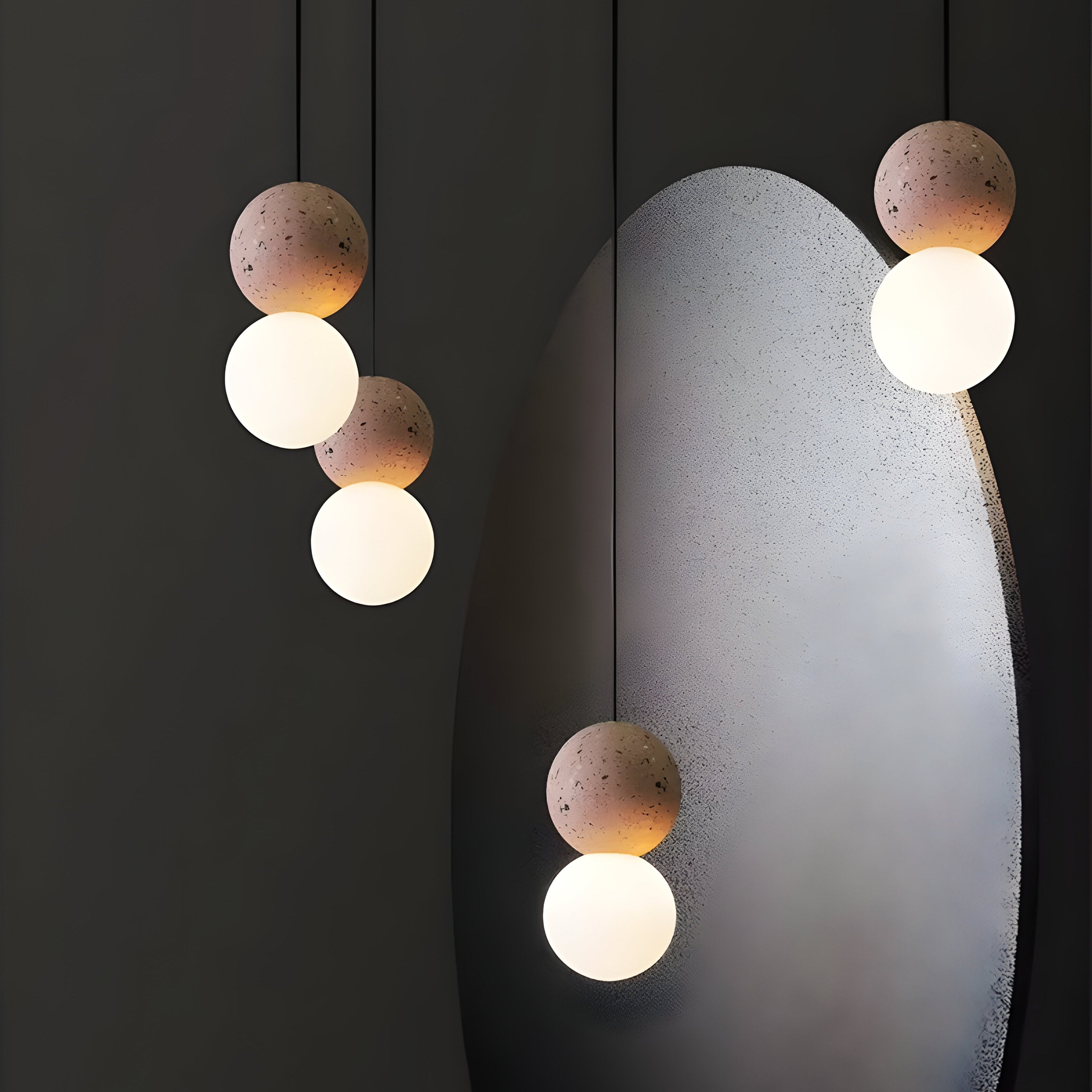 Elevate your space with the artistic Berrit dual-globe Pendant Light, featuring a striking combination of textured stone and frosted glass for a bold yet elegant aesthetic. The contrasting materials create a modern, sculptural look, while the soft, diffused glow adds warmth to any interior. Perfect for contemporary, industrial, or minimalist spaces, this unique lighting fixture makes a statement in dining areas, living rooms, or boutique settings.