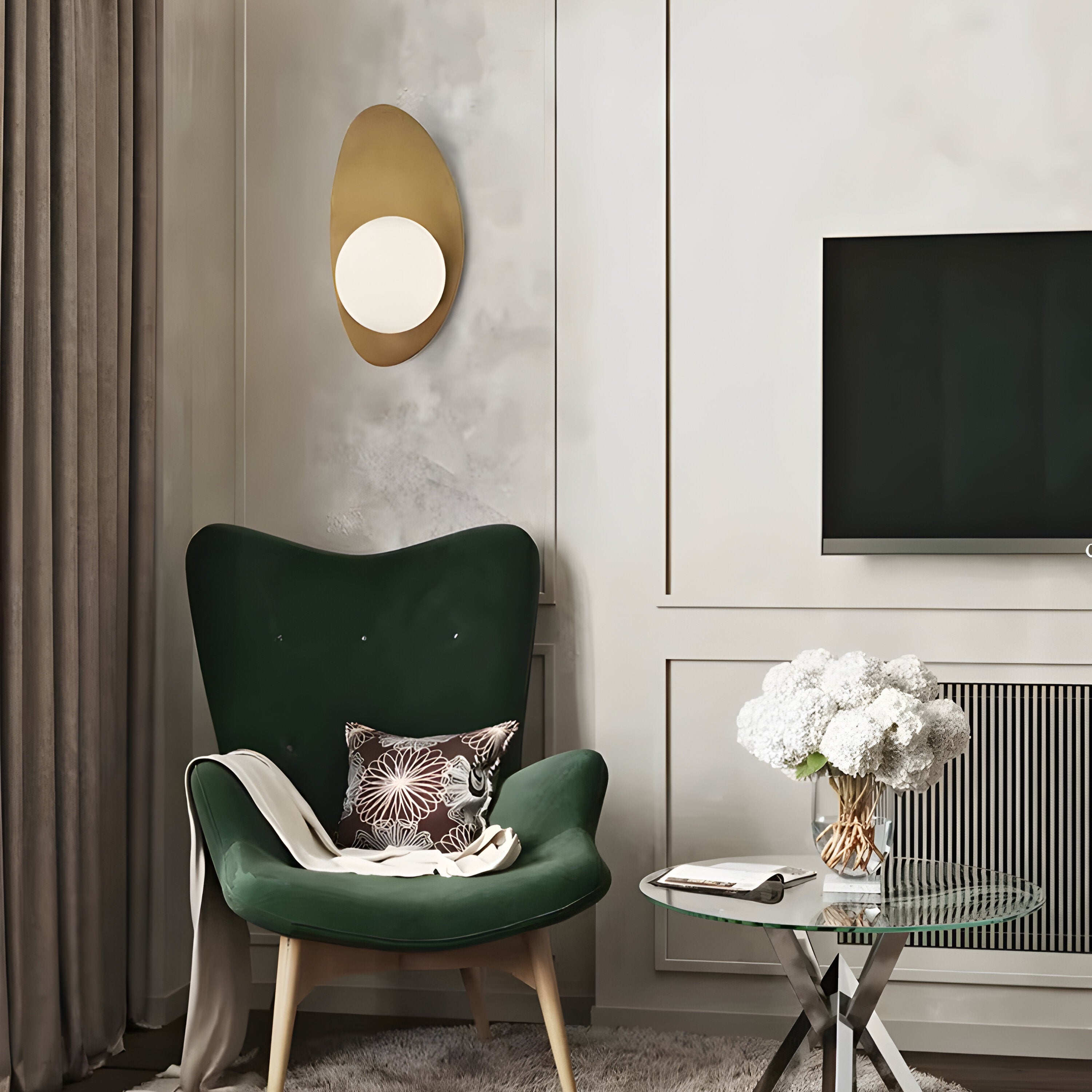 The Jois Wall Light features a sculptural, asymmetrical backplate crafted from richly textured material. This organic form provides a striking contrast to the clean, spherical glass diffuser, which emits a soft, ambient glow. The interplay of shapes and materials creates a visually captivating piece, adding a touch of modern artistry to any space. Ideal for hallways, living rooms, or bedrooms, this wall sconce offers both style and a warm, inviting light.