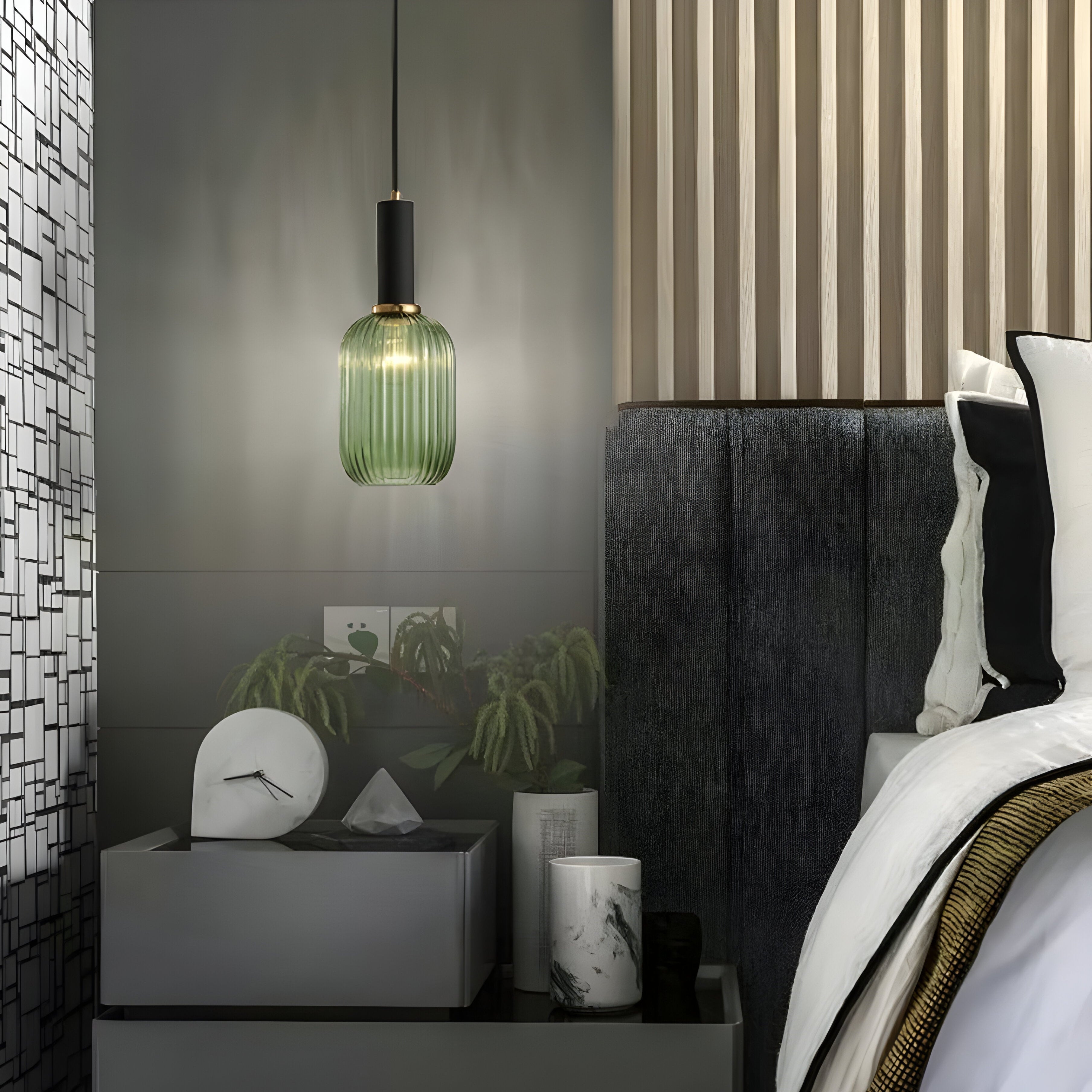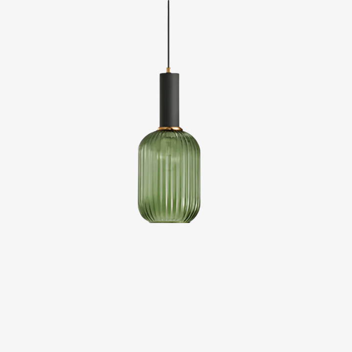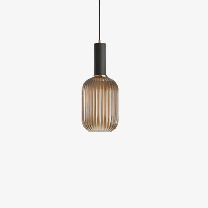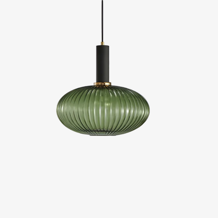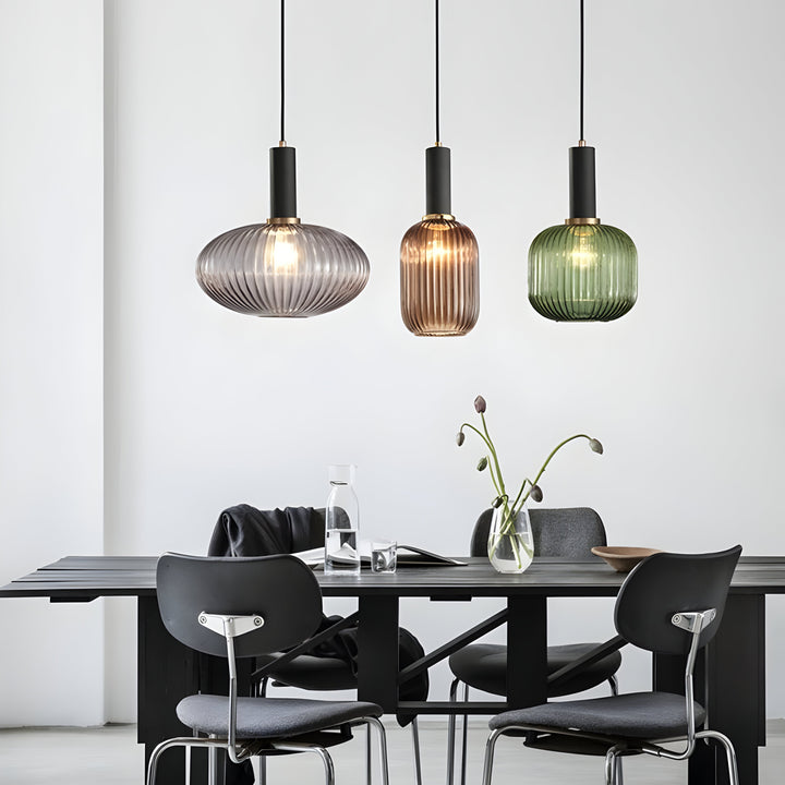 The Koara II Pendant Light offers a touch of vintage-inspired glamour to modern interiors. Featuring hand-blown glass shades with a delicate fluted texture, available in a variety of elegant colors (as shown here in amber, smoke gray, and green). The rich, polished black accents and canopies complement the glass beautifully, creating a sophisticated and warm ambiance. Ideal for adding a subtle statement to dining rooms, living areas, or bedrooms, these versatile pendants can be hung individually or in multiples for a more dramatic effect.