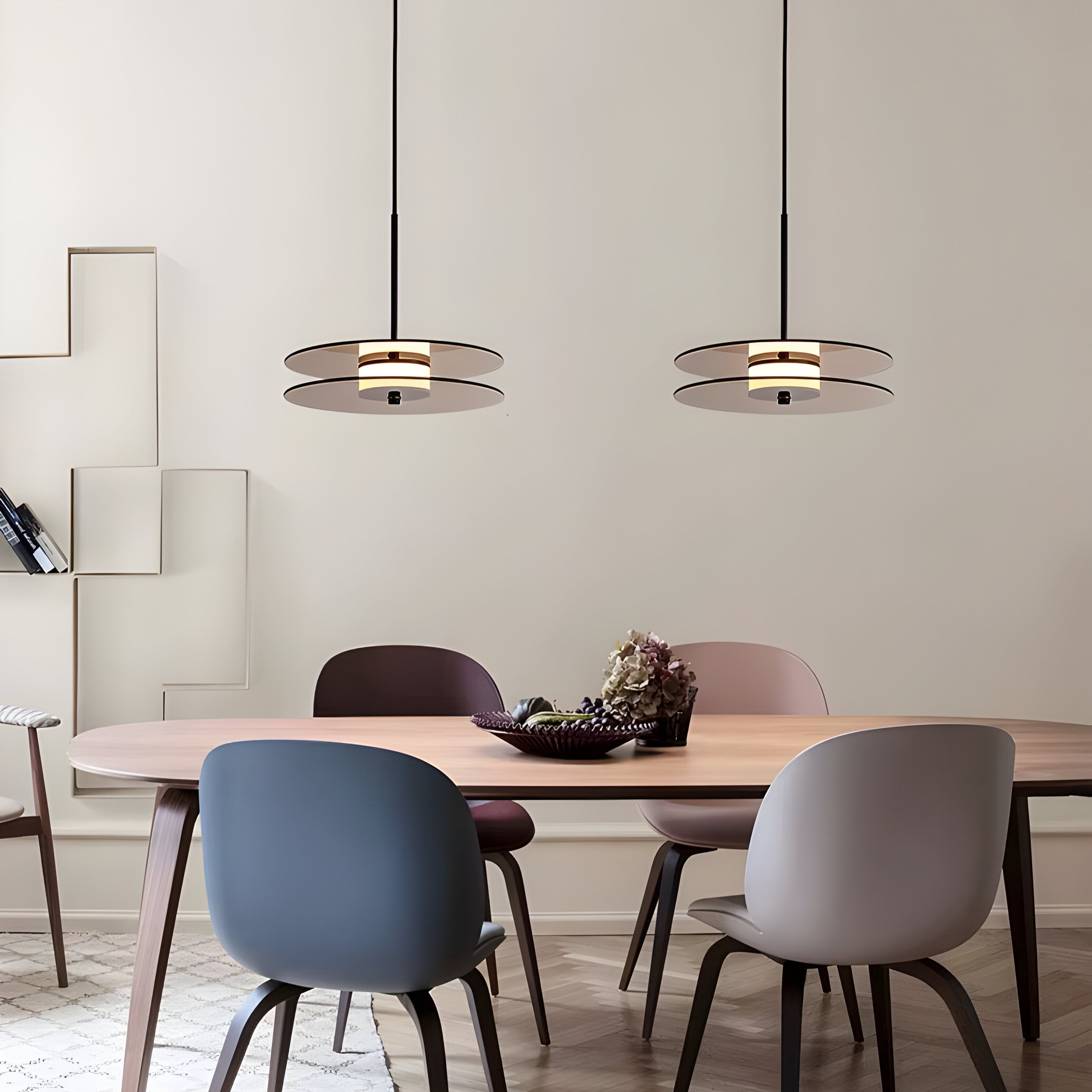 The Orion Pendant Light is a study in minimalist, modern design. This striking fixture features a slender, cylindrical center encased within a flat, circular shade, creating a visually arresting composition. The shade itself appears to float effortlessly, adding a sense of lightness and sophistication. Orion provides a warm, diffused light, ideal for adding a touch of contemporary elegance to dining rooms, living areas, or bedrooms. Its clean lines and understated form make it a versatile choice for a variety of interior styles.