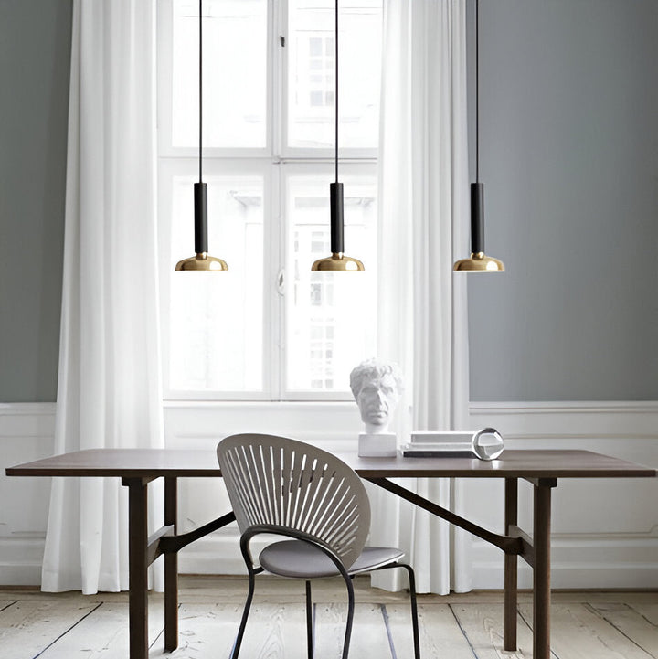 The Serlo Pendant Light offers a study in simple elegance. This pendant features a sleek, cylindrical shade in a smooth, matte finish, suspended by a slender cord. The understated design is punctuated by the warm gleam of the metallic socket and canopy, adding a touch of subtle sophistication. This versatile pendant provides a focused downlight, perfect for illuminating kitchen islands, dining tables, or workspaces, while seamlessly blending into a variety of modern interiors.