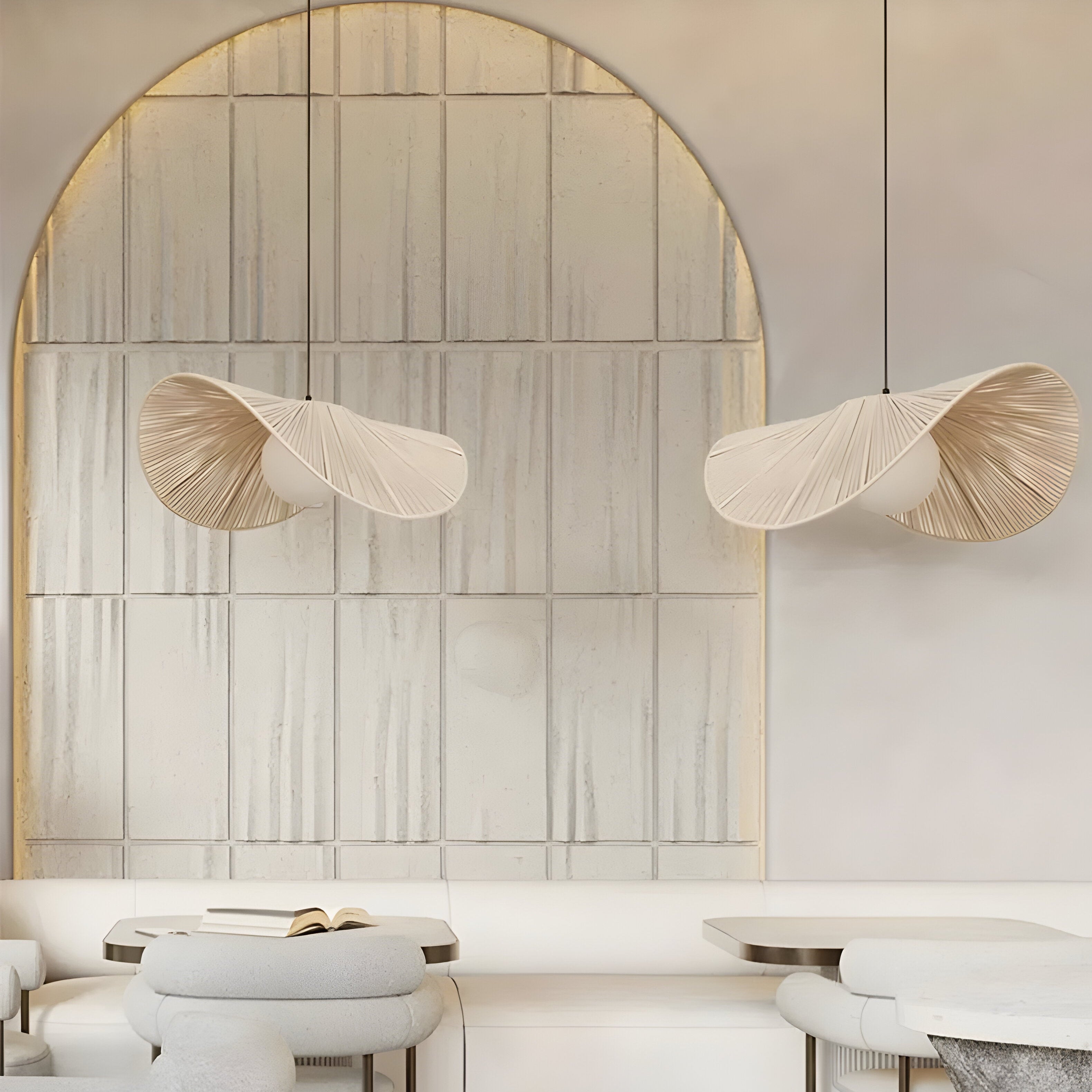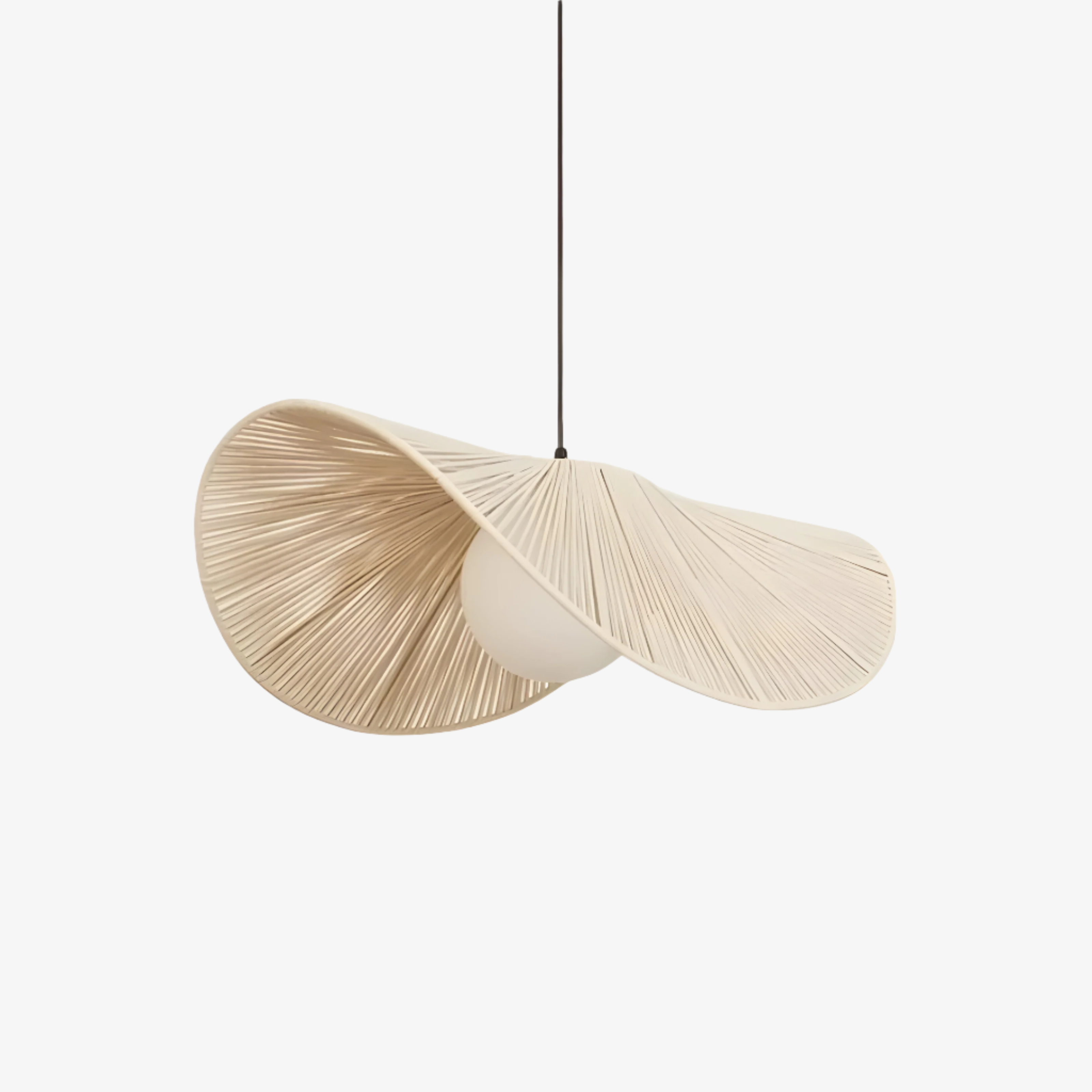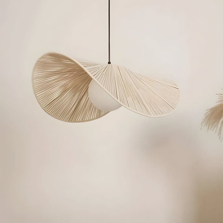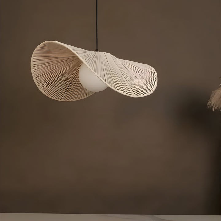 The Supri Pendant Light exudes a bohemian, free-spirited charm. This unique pendant features a wide, dramatically sloped shade crafted from natural cotton rope, reminiscent of a stylish sun hat. The woven texture adds an organic touch and diffuses the light beautifully, creating a warm and inviting ambiance. The integrated LED light source provides energy-efficient illumination. Ideal for adding a touch of relaxed elegance to living rooms, bedrooms, or sunrooms, this pendant light brings a touch of natural artistry to any space.