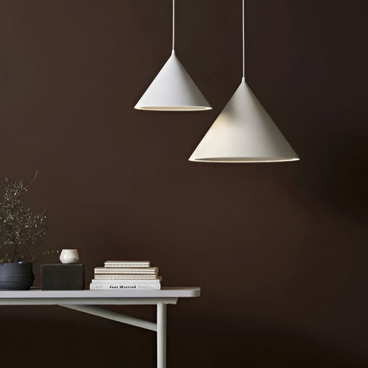 The Triangular Pendant makes a bold statement with its clean, geometric silhouette. Featureing a classic cone-shaped shade crafted from smooth, matte-finished metal, offering a timeless yet contemporary aesthetic. Triangular adds a touch of understated elegance to any space. The simple design allows for versatile placement, whether hung individually over a kitchen island, in pairs flanking a sofa, or in multiples for a more dramatic lighting installation in dining areas or entryways. This pendant provides a focused downlight, perfect for task lighting or creating a warm and inviting ambiance.